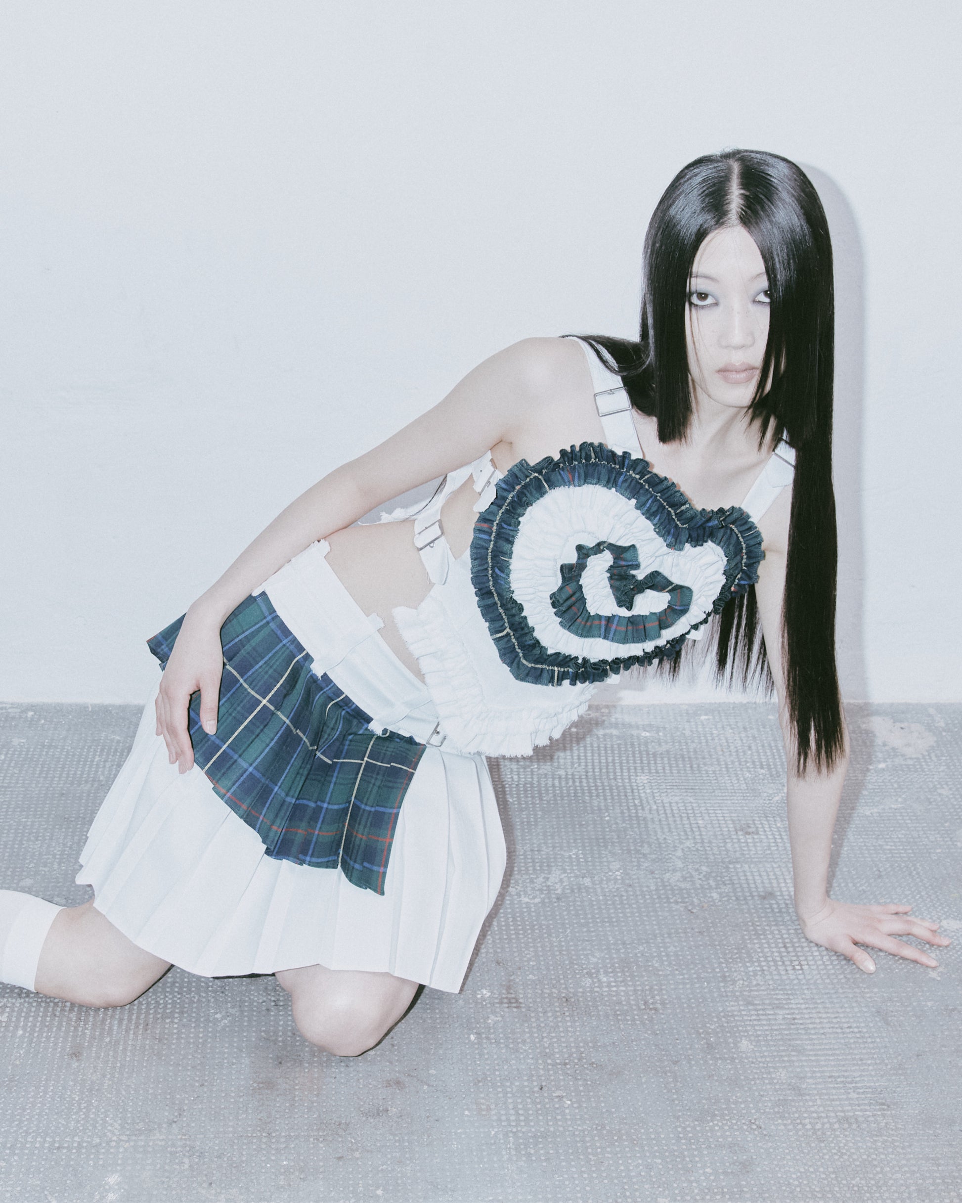 Vanessa Baernthol heart vest top from certified denim cotton twill with ruche details from premium glen check fabric.