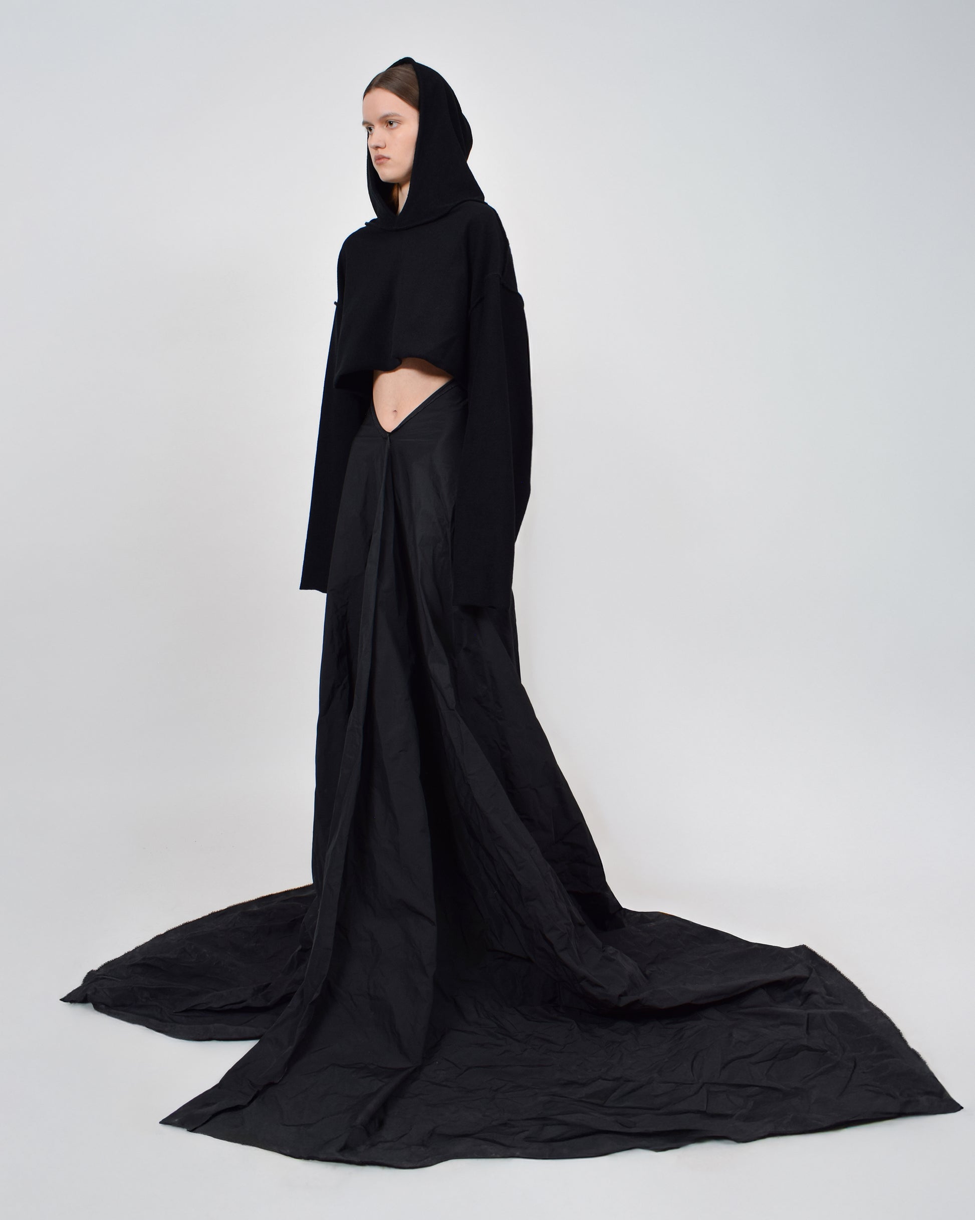 Vanessa Baernthol opulent evening skirt with sculptural silhouette and train, show piece from the FW25 Berlin Fashion Week runway, made from premium black taffeta fabric, matte with soft shine.