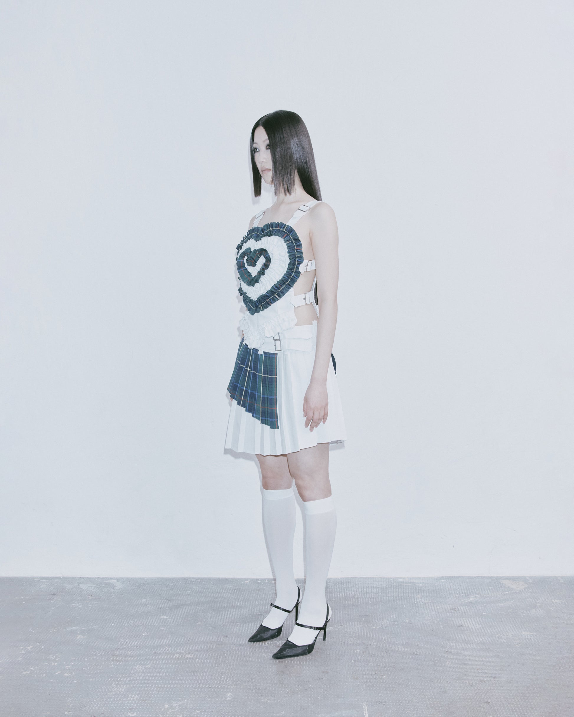 Vanessa Baernthol two-piece asymmetrical mini skirt, hand pleated from premium glen check fabric and certified denim cotton twill.
